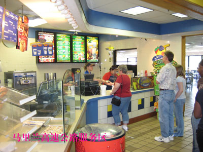 4、服务区内有多家品牌餐厅都是供应手拿快餐食品,如炸鸡、薯条、水果、热狗、披萨、面包甜品、爆米花等,所有水和饮料都放入冰块中冷冻。设有少量临窗座席,消费者可以看到食品现场制作过程。也有食品区出售包装食品,有自选售货服务,有自动售货机。礼品、服装、伞鞋、蔬菜有另一间售货厅,因不是服务区热门商品客人很少。