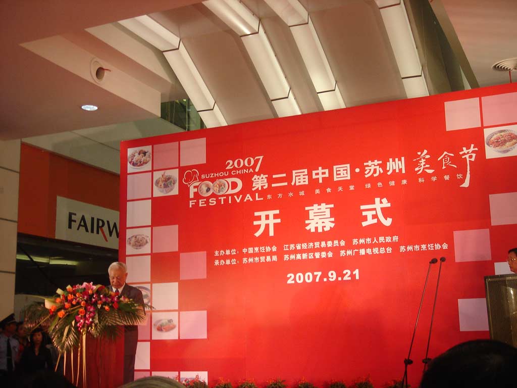 9月21日,由中国烹饪协会、江苏省经贸委、苏州市人民政府主办的第二届中国·苏州美食节隆重开幕。江苏省副省长李全林,世界中国烹饪联合会会长、中国烹饪协会名誉会长、原商业部副部长张世尧,中国烹饪协会常务副会长杨柳,江苏省政府副秘书长、江苏省经贸委主任韩庆华,苏州市委常委、副市长周伟强等领导出席了美食节开幕式。来自重庆、广东、福建、河南、安徽、宁夏、江苏、山西、新疆等省(市)美食名城的领导、行业组织负责人、嘉宾以及专家学者;南京、徐州、无锡、常州、南通、镇江、扬州、泰州商贸主管部门的领导、行业协会负责人;苏州市、区领导、商贸部门和行业协会负责人;第二届中国·苏州美食节成员单位负责人,以及餐饮企业的代表、新闻媒体的记者近800人参加了开幕式。