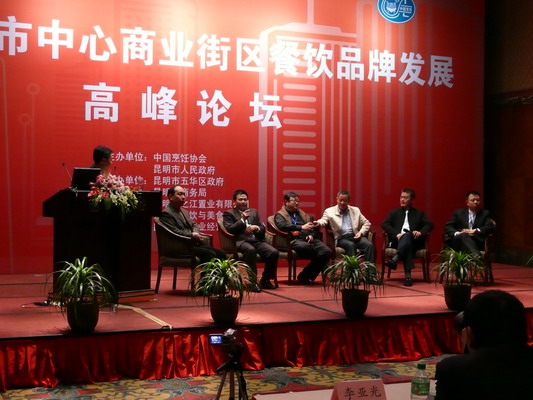 由中国烹饪协会和昆明市人民政府共同主办的“中国城市中心商业街区餐饮品牌发展高峰论坛”1月8日~9日在昆明举行。中国烹饪协会常务副会长杨柳和昆明市委常委、副市长王晓光与来自全国各地的十几位知名品牌战略专家、餐饮连锁专家、商业策划专家和国际风险投资专家以及近百名著名餐饮品牌企业家参加了论坛,并就“打造品牌集群、提升竞争能力”等主题进行了深层次的研讨。
