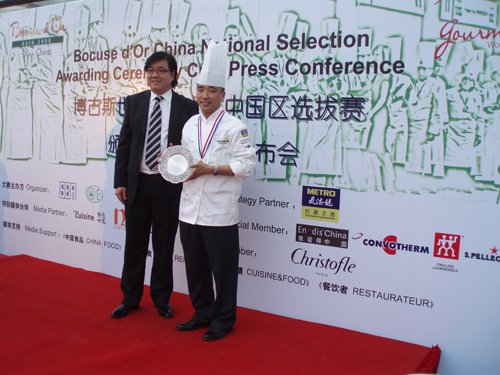 经过近9个小时紧张激烈的角逐,来自浙江开元酒店集团行政总厨李伟强以总分第一获得了中国冠军选手称号,获得了代表中国进军博古斯大赛亚洲洲际选拔赛的资格,并同时获得最佳菜谱创意奖;李小华获得最佳主菜奖;郝小雷获得明日之星厨师奖;黄皓宇获得双立人烹饪大师奖;张腾峰、刘超获得入围奖。决赛结束后,举行了隆重的颁奖典礼,中国烹协西餐专委会副主任兼秘书长边疆、SBA中国区主席博德礼先生出席了颁奖典礼并为获得主要奖项的选手颁奖,本次博古斯世界烹饪金奖大赛中国区选拔赛的赞助商麦德龙现购自运公司、依诺得公司、上海双立人亨克斯有限公司、康福登新科技厨房设备公司、圣培露矿泉饮料公司、克里斯托福银器公司等国际著名品牌的代表出席了颁奖典礼并为获奖者颁奖。
