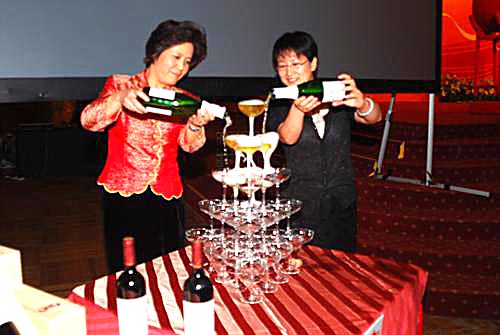 图4、常务副会长杨柳与北京龙徽酿酒有限公司总经理为香槟塔注入香槟