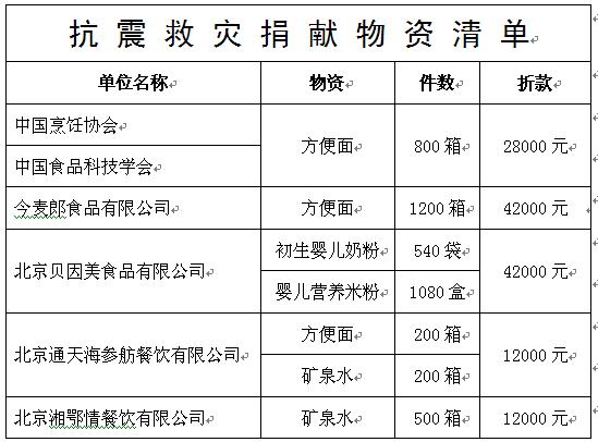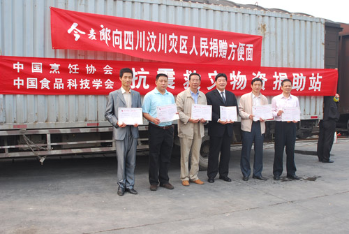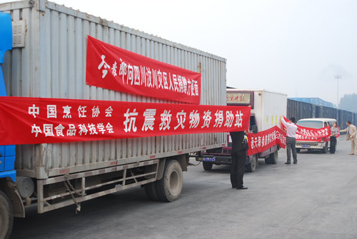 地震灾情发生后,中国烹协即积极会同中国食品科学协会组织餐饮企业和食品生产企业对灾区进行捐助,北京通天海参舫餐饮有限公司、北京湘鄂情餐饮有限公司、今麦郎食品有限公司、北京贝因美食品有限公司积极响应,仅两会就捐助了大批食品和饮水,中国烹协随即与北京市政府救灾物资捐赠中心联系,将所捐物品及时装上北京市首趟救灾物资专列。