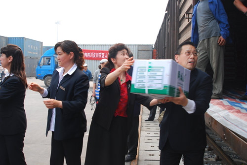 5月16日上午11时,随着北京大红门铁路货场最后一箱救灾食品运送上车,发自北京的首趟救灾专列承载着北京人民的祝愿启程出发。由中国烹饪协会会同中国食品科学协会、通天海参舫、湘鄂情、今麦郎、北京贝因美等餐饮企业和食品生产企业为灾区提供的总价值十万余元的方便面、矿泉水、婴儿奶粉等物资也随着这趟专列送往灾区。