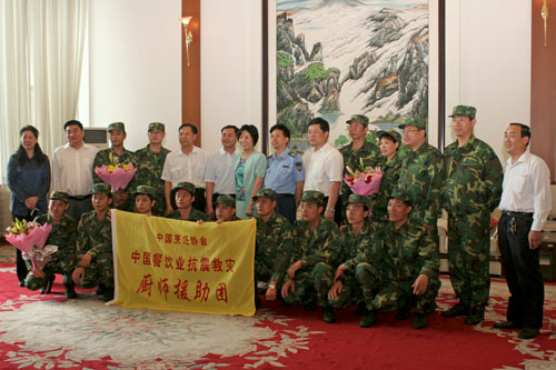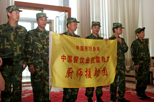 在得知抗震救灾一线烹饪技术人员紧缺的消息后,中国烹饪协会党支部紧急部署,连夜筹备组织了厨师抗震救援队。救援队由来自北京大学餐饮中心、天津集贤大酒店、北京大董烤鸭店、河北天然居的厨师组成,自