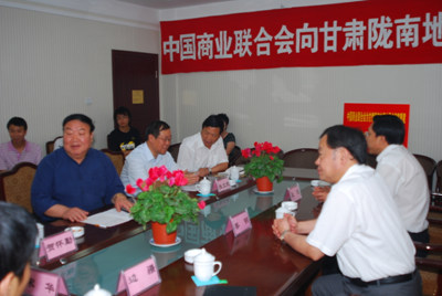 考察组由中国商业联合会副会长兼秘书长姜明任组长,一行四人于25日抵兰州,听取了甘肃省商业联合会、甘肃省烹饪协会关于全省商业、餐饮服务业地震受灾情况汇报。当晚,甘肃地震重灾区、紧邻四川省汶川的陇南市商业局,派两位副局长行程700余公里,冒着余震和道路塌方的危险,用10个小时赶到兰州,向考察组汇报了重灾区的情况及面临的困难。6月26日,考察组在兰州举行了“中国商业联合会向陇南市商业局捐款仪式”,由姜明组长亲手将此次商联会、中国烹协等单位捐献的13.5万元当场捐给陇南市商业局副局长王德新,甘肃省电视台、兰州市电视台、中国商报、兰州晨报等近10家全国和地方媒体采访了并报道了捐款仪式。甘肃省商务厅副厅长张立民、商业联合会会长王义祥、烹饪协会秘书长马春芬等出席了捐款仪式。