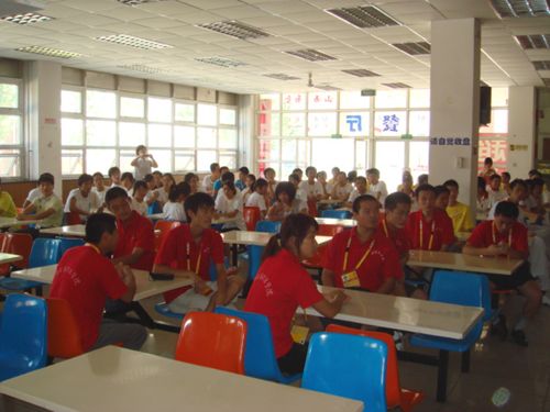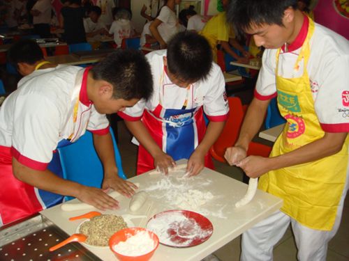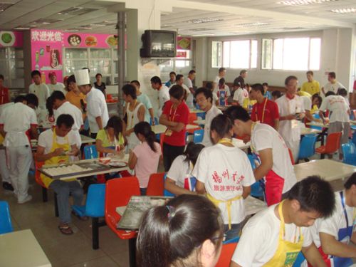 由于人数过多,场地有限,30组选手分为2大组进行比赛。“比赛开始”刚刚声落,各位同学就忙碌起来,第二组参加比赛的同学都在旁边认真学习,吸取经验;各校老师、同学认真观看其他学校同学包饺子的手法、样式,互相学习、互通经验。尽管食堂内没有空调,又由于人员过多,食堂内较为闷热,很多参赛选手都汗流浃背,但仍然一丝不苟坚持比赛,观看比赛的同学们不由自主纷纷为参赛选手加油鼓劲。
