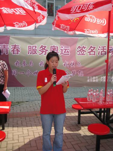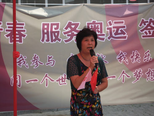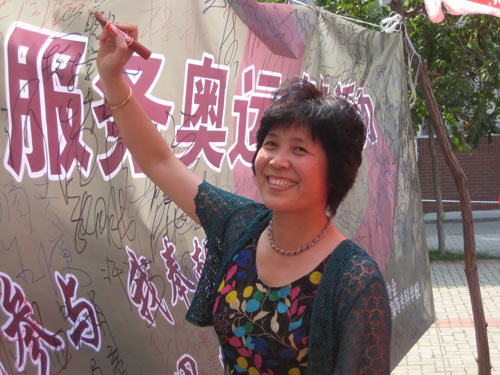 最后,杨柳会长和全体师生共同唱起了《北京欢迎你》,并在“奉献青春、服务奥运”条幅上签下自己的名字和誓言。
