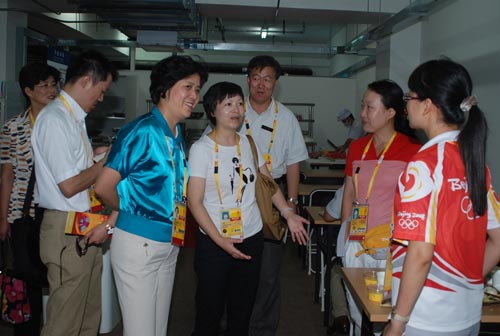 这已是杨会长第二次来到奥运中心区看望涉奥餐饮工作人员。在主新闻中心的工作人员餐厅,她与就餐中的师生亲切交谈,了解工作人员在这里的伙食情况;在国际广播中心,她详细询问了菜品供应情况和工作人员的工作班次、劳动强度;在奥运村的餐饮指挥中心、中央厨房,来自美国的厨房运营总监道格?布先生向杨会长一行介绍了厨房的运行情况,并高度评价了中国烹协选派的涉奥餐饮工作者,对他们的工作精神、学习态度和合作能力备加赞扬。他表示,中国学生非常勤奋好学,领悟能力很强,使他原本的担心很快就打消了。他甚至希望能组织这些中国学生到美国去参加新的项目。杨会长一行还专门到厨房看望了正在工作中的同学们。她高度评价了广大师生不辞辛苦、连续奋战的精神,肯定了大家为奥运所做贡献,代表中烹协对大家表示衷心的感谢,并勉励大家继续为各国奥运健儿和媒体工作人员奉献可口的饭菜。