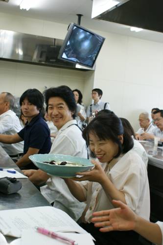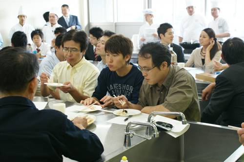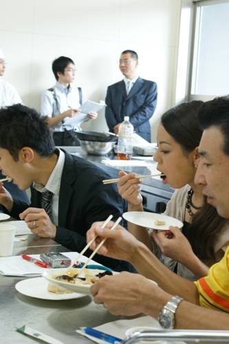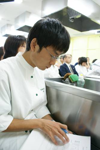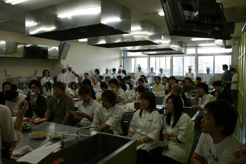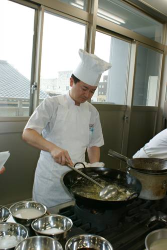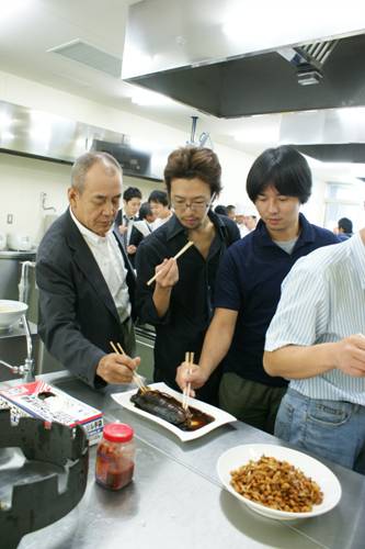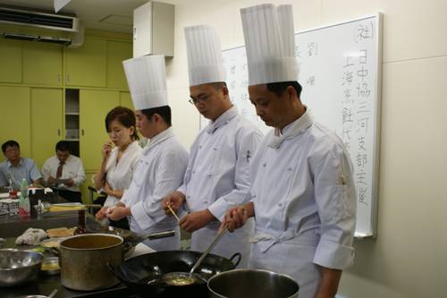 在丰桥调理制果专门学校表演现场,70余名来自中部地区中餐企业的厨师和该校部分中式烹调学生济济一堂,现场观摩学习中国烹饪技艺。演示过程中学员们不断提出疑问,中国烹饪代表团的厨师及时予以解答,现场气氛热烈异常。该校派往东京参加观摩学习的老师还在现场学习实践,当表演的中国厨师在台上操作演示时他们就在后面学习制作,按照上次学习的心得体会结合现场演示环节,将5道菜分别做好并将成品分给学员们品尝,让学员们不仅能观摩学习制作过程,还能直接感受菜品的色、香、味、形、养。演示结束后,学员们纷纷涌上前台与演示者进行交流。