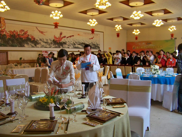 据宋大师介绍,共有来自全国12个赛区的31名选手参加了这次比赛,这些风格各异的餐台设计把中国餐饮文化的内涵表现得淋漓尽致,台台主题鲜明,构思独特,寓意深刻,再加上选手们得体的举止言行,娴熟利落的操作,给人一种美的享受,充分体现了中华民族礼貌待客的传统美德。