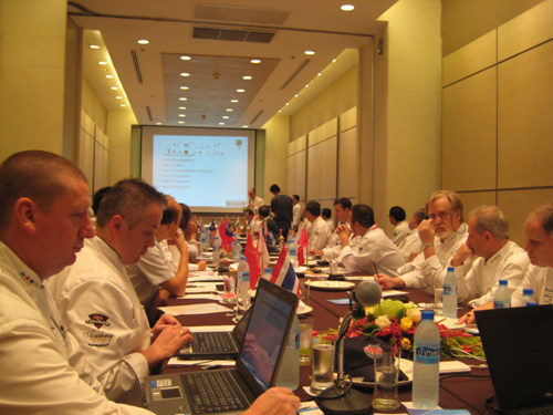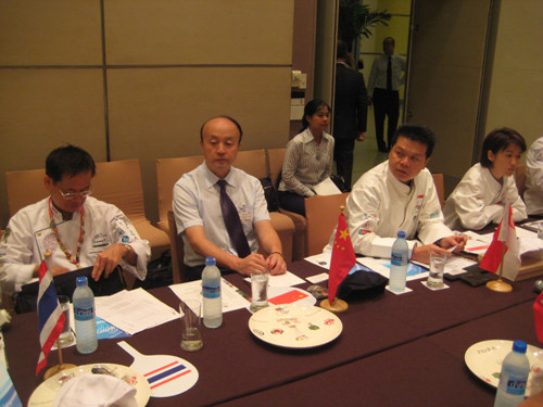 在世厨联亚洲区执委斯罗尼先生介绍完参加会议的世厨联亚洲国家成员后,澳大利亚、中国、印尼、马来西亚、日本、缅甸、马尔代夫、尼泊尔、巴基斯坦、菲律宾、新加坡等国家的代表先后发言,介绍本国厨师组织和开展的各项活动。中国烹饪协会名厨委秘书长潘延光向与会代表介绍了中国烹饪协会第五届会员代表大会、全国烹饪技能大赛、餐饮业发展大会情况以及08年中国烹协在5.12抗震救灾、支援奥运方面发挥的作用,并盛情邀请广大代表参加今年十月在扬州举办的第19届中国厨师节。世厨联主席盖德曼德森先生愉快地接受了邀请。