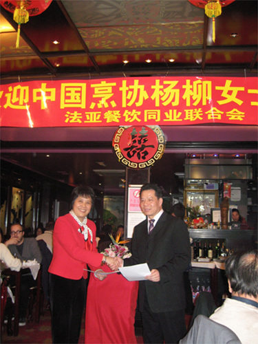 应法国亚裔餐饮同业联合会之邀,世界中国烹饪联合会长、中国烹饪协会常务副会长杨柳于11月26日 至28日对该会进行了友好访问。双方就在法国发展中华饮食文化,培养一批优秀的中餐技艺人才,开展美食交流活动等内容进行切磋。双方并就共同发展,促进中餐在法国发展,提升欧洲中餐业的水平和形象等事宜签署了一项战略合作协议。协议内容包括:双方将开展人员和专业书籍的交流,在巴黎建立中餐书刊图书室,供华人从业者学习;中国烹协为法华社团提供技术培训和厨师级别鉴定指导;开展国际交流,共同促进中餐业在欧洲的传播;双方合作在中法两国举办“中国美食之旅”和“中国美食节”活动等。法国各界华人、华侨以及使馆代表六十多人出席了招待晚宴和签字仪式。