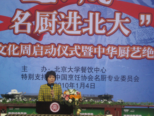杨柳常务副会长在启动仪式上发表了精彩的演讲,在广大师生中引起了热烈的反响。在演讲中,她表示“名厨进北大”活动在中国烹饪史上堪称首次,也是协会与高校开展的规模最大的活动。在此次活动中,北大各级领导对高校餐饮事业的发展给予了大力的支持,北大餐饮中心不仅为北大师生提供了优质餐饮服务,也为推动高校后勤社会化改革做出了有益探索。同时,杨柳常务副会长还表示,希望通过此次活动,能让北大学子们深入了解中华饮食文化的博大精深,更多地关注并投身于餐饮业的发展。