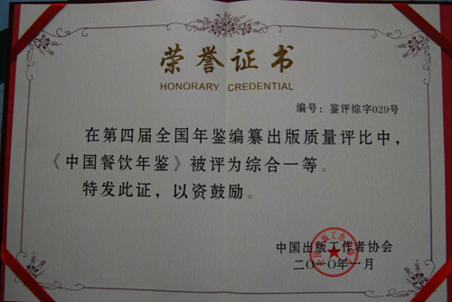 5月11日~12日,第四届全国年鉴编纂出版质量评比颁奖暨第十二届全国年鉴学术年会在济南召开,2010年举办的第四届全国年鉴编纂出版质量评比结果出炉,《中国餐饮年鉴》获一等奖。中国出版工作者协会常务副主席刘波、山东省政府副秘书长马越男、中国出版工作者协会年鉴工作委员会主任许家康等领导为获奖单位颁奖。五年一届的全国年鉴编纂出版质量评比由中国出版工作者协会主办,是我国年鉴界最权威的评比活动。