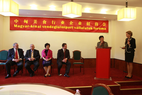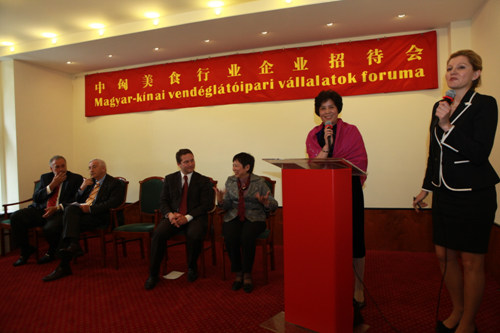 在中匈美食企业招待会、座谈会和展示会上,匈牙利国会副主席乌伊海伊,饭店协会主席布道伊卡波先生,美食协会主席和匈牙利著名的餐饮企业家、葡萄酒商、新闻媒体近百人参会,据悉这是首次由大使馆组织的如此隆重的中匈两国餐饮业同行的交流活动。