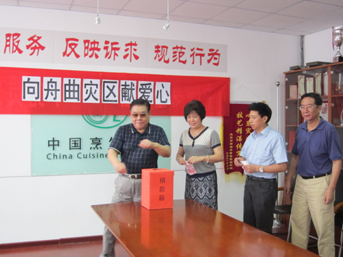 8月16日下午,党支部书记苏秋成率先捐款并提议,协会党支部向全体党团员、职工发出倡议书,动员党员积极参加、职工自愿参加向舟曲灾区捐款活动。倡议书说:为了帮助甘肃舟曲受灾群众渡过生活危机,中国烹饪协会党支部响应党中央、国务院的号召,倡议协会全体党员、共青团员和广大职工立即行动,向受灾同胞伸出援助之手,奉献爱心,捐赠善款,帮助灾区人民抗洪救灾,重建家园!倡议书在办公内网发出不到5分钟,捐款箱边已经聚集了许多党员、职工,大家纷纷为灾区献上自己的爱心,广安门办公区的20多位党员职工也组织了小小的捐款仪式,刚刚出席联合国会议到京的杨柳副会长,在机场打来电话捐款。骨折受伤在家休养的职工听到消息专程打车到协会来捐款,在协会实习的大学生也纷纷献上自己的爱心……到17日上午协会全体党员、职工70人全部参加捐款,党支部将立即把大家所捐的6680元通过上级机关送往灾区。
