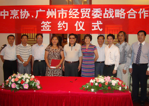 为了全力支持广州举办第十六届亚洲运动会,促进餐饮业发展,提升广州地区餐饮服务水平,培育粤菜引领发展的强势品牌,弘扬中华粤菜饮食文化,打造广州世界美食集结地,8月28日,中国烹饪协会与广州市经贸委签署战略合作协议,建立长期战略合作关系。中国烹饪协会苏秋成会长、杨柳常务副会长与广州市经贸委赵小穗主任、郭伟光、陈勇副主任、谭海莹副巡视员,越秀区副区长卞勇和荔湾区副区长蓝小环,广州饮食商会会长区又生、饮食协会会长秦鉴洪等共同出席了签约仪式。杨柳常务副会长与赵小穗主任分别代表双方签署了战略合作协议。