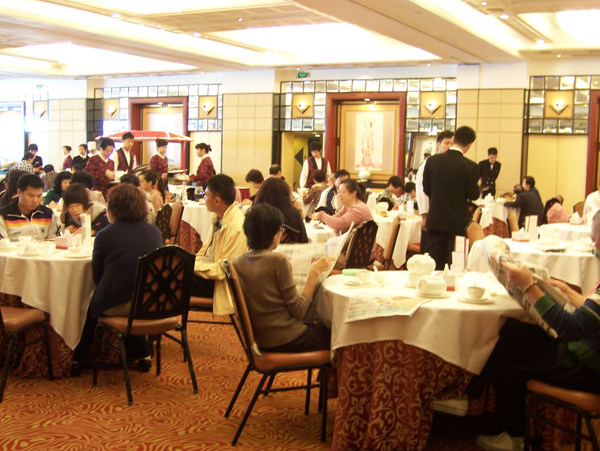 考察团员晚宴后,入住在位于广州历史悠久的沙面岛南边,有着中国第一家五星级酒店称号的广州白天鹅宾馆。在庭院式的酒店里,考察团团员不仅在临窗能见珠江景致的西餐厅品尝了广州白天鹅的经典西式早餐,而且在工作人员的带领下参观了白天鹅的中餐厅,感受到最具广州特色的早茶文化。早晨7点多的白天鹅中餐厅,座无虚席,懂得生活享受的广州市民,或一家几口,或三两好友,一边漫不经心地翻着报纸,一边随意调侃着,桌上摆着的是精致味美的广州小点。晶莹剔透的水晶虾饺、酥脆可口的酥皮蛋挞还有清香四溢的各式粥品,广州的饮食文化特色跃然而现,特别是广州人早晨见面打招呼的那句“饮左茶未?”,将“食在广州”的特色发挥得淋漓尽致。