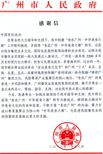 日前,广州市政府向我会发来感谢信,表示广州市将以获得“食在广州·中华美食之都”称号为新起点,在我会的支持下,继续致力推动中华美食文化的传承和发展,不断丰富“食在广州”的内涵,着力打造以粤菜集聚区为核心的“中华美食之都”,为促进我国餐饮业的持续繁荣发展做出更大的贡献。