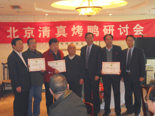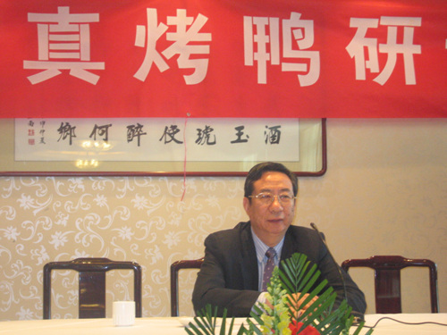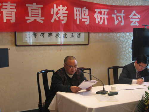 研讨会上,中国烹饪大师、清真烤鸭传人艾广富先生就北京清真烤鸭发展情况做了主题发言,重点探讨了清真烤鸭如何在继承传统烤鸭烹饪的基础上进行创新发展,让全国全世界人民享受更加美味可口的清真烤鸭,并以一首《汤头歌诀》将北京烤鸭的前世与今生清晰而生动地展现在与会者面前,最后他针对食用清真烤鸭经常出现的问题做了详细分析。北京翔达南来顺饭庄的范嘉明总经理针对目前北京烤鸭没有统一的技术标准问题,提出了自己的建议。北京鸿云楼饭庄总经理、中国烹饪大师马志和就清真烤鸭的培训问题向大会主办方提出了富有创造性和建设性的意见。“鸭五”张占杰大师及北空皇亭子宾馆副总李荣云上校等各个领域的餐饮界知名代表,根据他们个人多年的生产、经营和管理经验,针对清真烤鸭及烤鸭鸭炉的搭建和创新做了广泛而有深度的讨论发言。