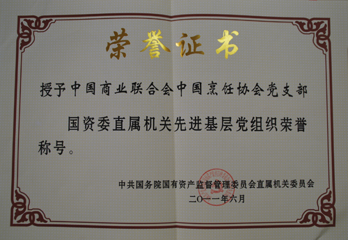 近日,国务院国资委在京举行庆祝中国共产党成立九十周年大会,回顾90年来党的光辉历程,表彰2009至2010年度创先争优活动中涌现出来的直属机关先进基层党组织、优秀共产党员和优秀党务工作者。会上,中国烹饪协会党支部再次被授予“国资委直属机关先进基层党组织”荣誉称号。